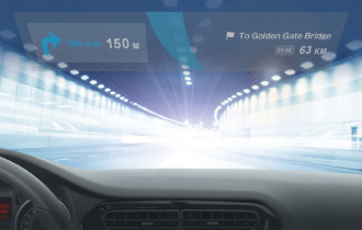 A head-up display projects various information onto the windshield of a car while constantly interfacing with electric toll collection (ETC) systems and cloud networks. This technology is expected to reduce driver inattentiveness by enabling them to obtain information without shifting their gaze. To realize safe and secure societies, USHIO is also engaged in the development of head-up displays.