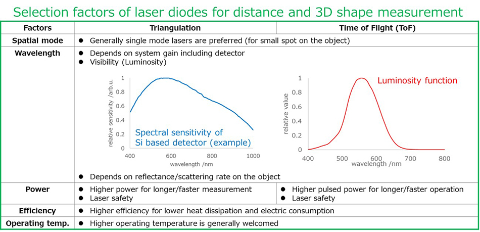 Overall, the output value of the laser diode is selected from various ranges based on the type of measurement. High power is required for long distance measurements or measurements requiring high-speed scanning, although low-power laser may need to be used for laser safety reasons. In terms of output power (especially for ToF measurements), the laser may need to be pulsed. The high efficiency and high allowable operating temperature of laser diodes are useful considerations for these selections.