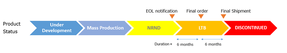 Ushio has defined five levels within the product lifecycle, from the development phase to discontinuation. Please refer to the chart and the definition of each status level.
