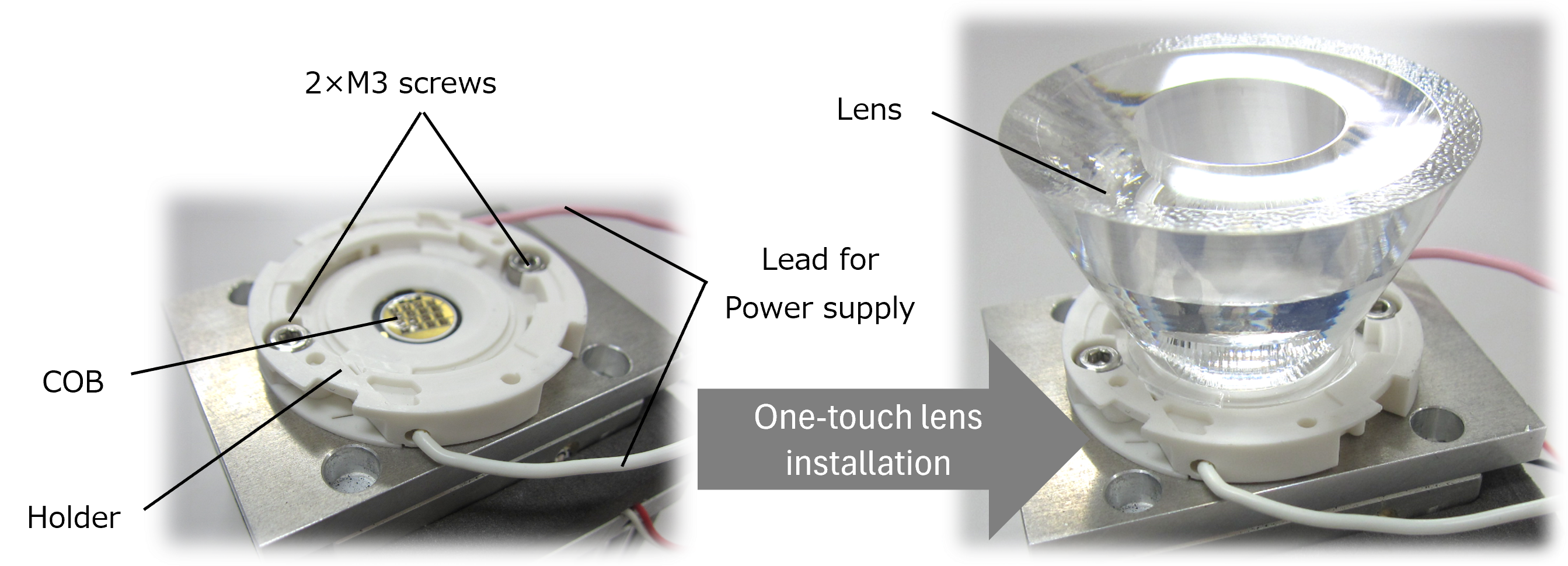 Moreover, commercially available COB holders and lenses can be easily attached, meeting various lighting needs in existing lighting systems.