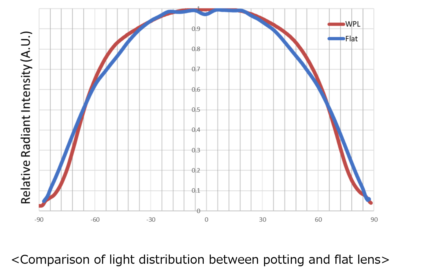 The light distribution characteristics are almost the same between the potting lens type and the flat lens type.