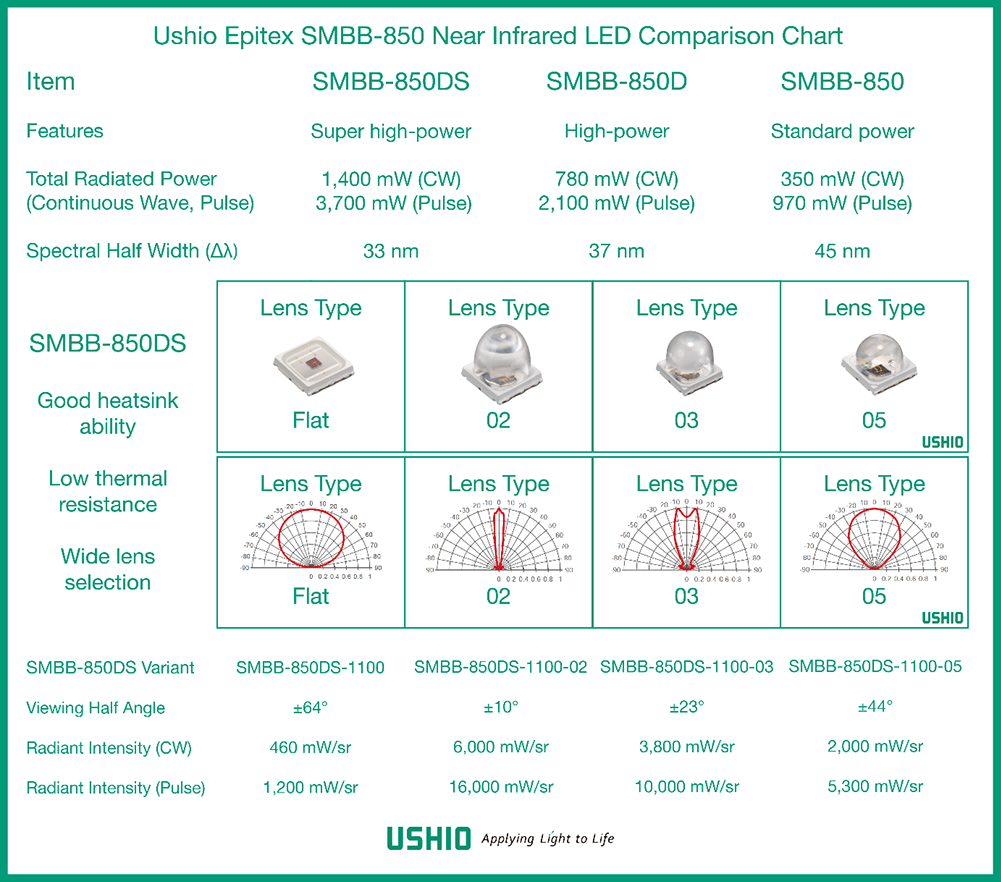 Ushio Epitex SMBB-850 series: 3 variants, 4 lenses, up to 3,700 mW optical output power