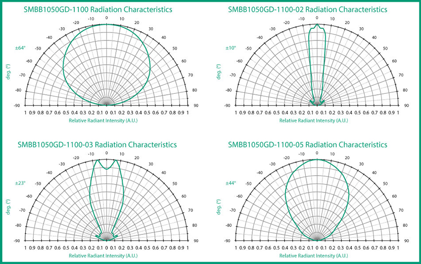 The flat and 05 lens types allow the radiation output to be emitted from the SMBB package at a broader angle. This produces a less-focused, lower radiant intensity light, but the width of illumination will be far greater. In the case of the SMBB1050GD, the flat and 05 lens types provide 230 mW/sr (milli-Watts per steradian) and 360 mW/sr, respectively.