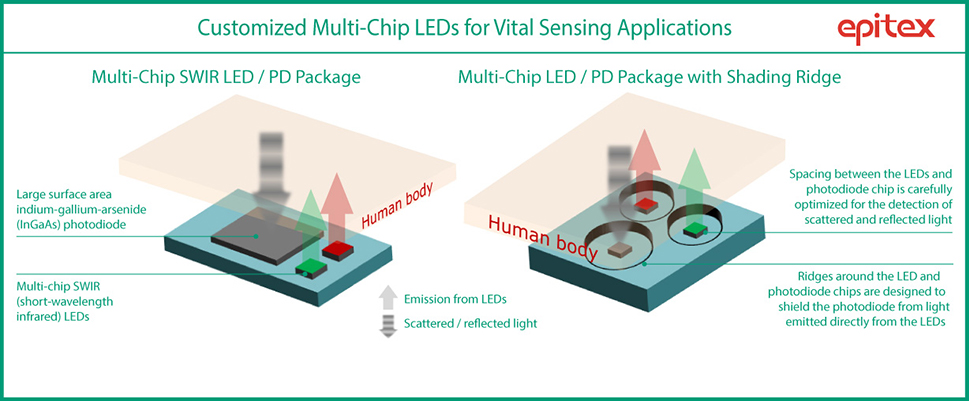 The standard multi-chip Epitex LED products fall into the SMT and mould type package families. Able to simultaneously emit two or three wavelengths of light, these LEDs are perfectly suited to low-power applications such as vital sign sensors and other medical instruments. Mould type LEDs are known as the archetypal standard for narrow angle light emission; however, this style of LED possesses quite a large package height. When space is a little tighter, SMT LEDs are the preferred standard, thanks to their shorter package taking up less room.