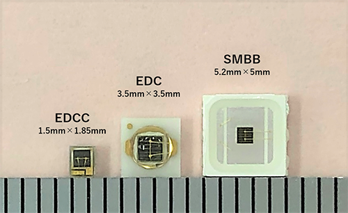 The EDCC Family incorporates traditional high-power LED chips with a wide range of wavelength options, yet it achieves an impressive reduction in footprint of approximately 80% when compared to the previous small-sized EDC Family package. As a result, it offers a compact form factor (W1.5 x L1.85 x H0.9 mm) that closely resembles bare chips and is also compatible with CSP (Chip Scale Package) and other compact-sized packages. This ensures not only ease of customization but also the convenience of handling SMD (Surface Mount Device) packages.