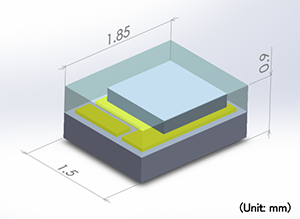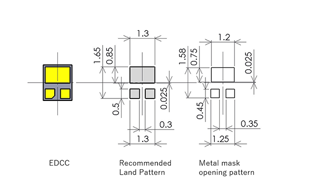 The EDCC Family incorporates traditional high-power LED chips with a wide range of wavelength options, yet it achieves an impressive reduction in footprint of approximately 80% when compared to the previous small-sized EDC Family package. As a result, it offers a compact form factor (W1.5 x L1.85 x H0.9 mm) that closely resembles bare chips and is also compatible with CSP (Chip Scale Package) and other compact-sized packages. This ensures not only ease of customization but also the convenience of handling SMD (Surface Mount Device) packages.