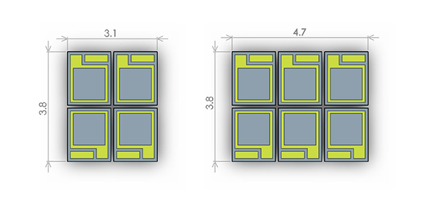 When EDCC packages are arranged in a 2 x 2 configuration, they fit within a compact 4mm x 3.2mm footprint, offering a package size nearly equivalent to the EDC package. Even when arranged in a 2 x 3 configuration, the total footprint remains compact at 4mm x 4.9mm, surpassing the SMBB package in terms of package area efficiency.