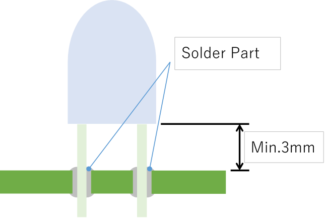 When soldering lead-through type products (mold type products, etc.), the distance from the bottom of the lens to the top of the board and the distance from the bottom of the lens to the soldering area should be at least 3 mm. Stress during assembly and heat generation during operation may damage the product.Also, do not apply load to the lead frame during heating.