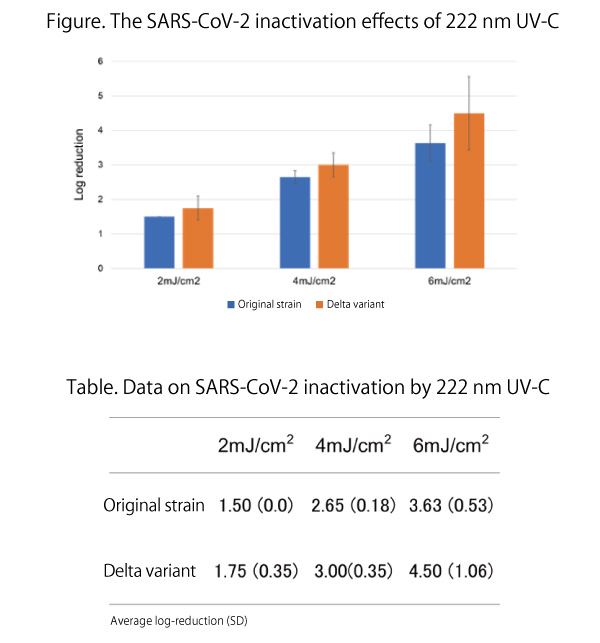 A whole-genome analysis was performed on SARS-CoV-2 clinical isolates, and the WHO confirmed that the isolates were the B.1.617.2 Delta variant. The variant, first identified in India, is categorized as “variant of concern.” We evaluated the effect of 222 nm UV-C light in the inactivation of these isolates. For each of the SARS-CoV-2 variants, a 5 μL of viral liquid was dripped onto a plastic petri dish, which was then irradiated with 222 nm UV-C light at 2, 4 and 6 mJ/cm2. Viral infectivity after ultraviolet ray irradiation was evaluated using the TCID50 method to evaluate the viral inactivation effects at the different illuminances compared with the infectivity of non-irradiated samples (n = 2). As initially estimated, 222 nm ultraviolet rays were shown to be as effective at inactivating the Delta variant as the original strain of the virus (see the figure and table below).