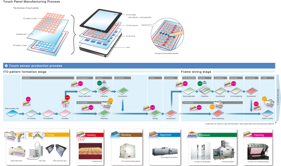 Ushio light and manufacture of touch panels Modification Litho-Patterning Curing and Bonding Cleaning Modification and Decomposition Liquid Crystal Display Biology and Chemistry Printing Energy Functional Materials MEMS, Electronic Components Semiconductors Printed Circuit Board and PKG Ushio light is used in manufacture of the touch panels that are the essential feature of Smartphones. Related Products Excimer lamps/Excimer irradiation unit