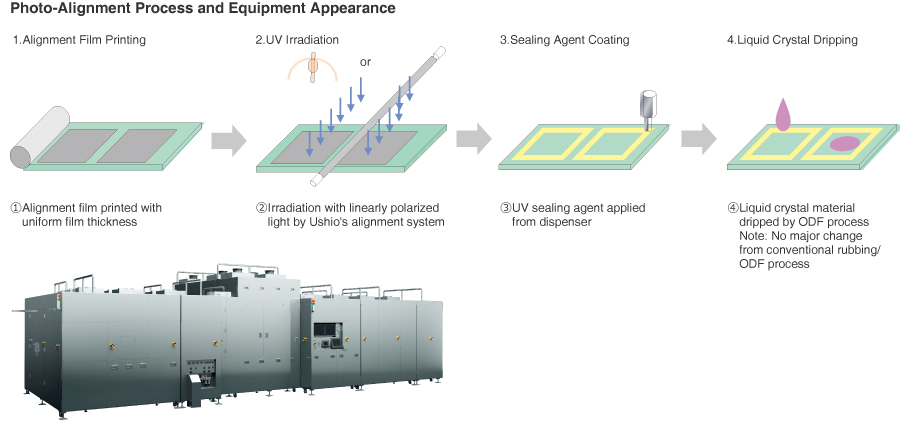 Photo-alignment equipment is primarily used in the production of liquid crystal displays. This equipment uses linearly polarized ultraviolet light to apply anisotropy to the alignment layer and arrange the liquid crystal in the required orientation. The equipment uses short arc lamps (super-high pressure mercury lamps) and long arc lamps (high pressure mercury lamps or metal halide lamps) as light sources. Use of linearly polarized light to align liquid crystal allows alignment to be conducted in a cleaner environment than was possible with former methods of alignment such as rubbing.
