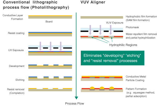 Irradiating the surface of an aqueous SAM (self-assembled monolayer) through a photomask with VUV light. Forming a hydrophilic pattern in the VUV-irradiated area. Forming a 5um L/S by applying conductive nanoink only to the hydrophilic area.