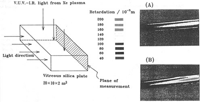 where x is the distance from center of a Newton’s ring to the edge of the specimen; in the case of Supraisil P20 No.1,10 mm, n is the number of the ring, 14, and λ is 632.8×10-6 mm. Assuming the boundary is at 1 mm from the concave surface,σ was estimated to be 6×106 Pa. This value was about the same as the averaged stress observed for specimen containing little SiOH, i.e., GE214 No.5. Hence, the deformation produced by illumination can be treated as an elastic deformation.