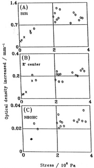 Fig.6 shows the relation between the averaged stress and microscopic changes produced by illumination, i.e., the creation of SiSi,E' and NBOHC degects.
