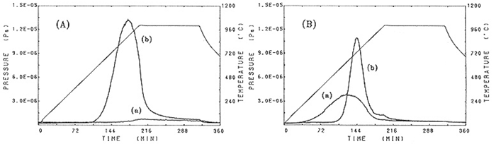 Release of H2 gas by GE214 No.10 and Suprasil P20 No.2 are shown in Figs.7(A) and (B), respectively. The curves for the illuminated and unilluminated specimens are labeled(b) and (a),respectively. H2 was released from illuminated GE214 in the range 600°C(115 min after starting to heat) to 1000°C(200 min). Neither O2 nor H2 gas was released from unilluminated specimens from 700 to 900°C. For Suprasil P20, H2 gas was released from an unilluminated specimen in the temperature range 150°C(24 ln after starting to heat) to 900°C(180 min). After illumination, on the other hand, the range of temperature in which H2 gas was released was 600-1000°C. The maximum in this temperature range increased after illumination. The temperature range of the specimen during illumination in the lamp was estimated to be about 600°C based on these data. The releases of O2 gas from GE214, in illuminated specimens, occurred in the higher temperature range with the maximum release at 1000°C (data not shown).