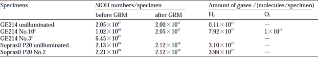 Table 2 shows the amounts of H2 and O2 detected in gas release measurement and the numbers of SiOH determined by IR absorption measurements for several GE214 and Suprasil P20 specimens. SiOH numbers were obtained by multiplaying the volume of specimen (0.4 cm3) by the concentration calculated from Eq. (10) andΔA was the difference of absorbance at 2.73 and 2.63µm.In the following we summarize these data.