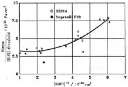 where σ was the value obtained though Eq.(6). Selecting data for three groups of specimens representing different ranges of SiOH concentrations in the surface 100µm layer, i.e. groups characterized by [SiOH] (a) 1.7±0.05×1019cm-3, (b) 2.35± 0.05×1019cm-3, and (C) 4.6 ±0.15×1019cm-3,and drawing a line from the origin of these plots, results in the three straight lines shown in Fig.12.