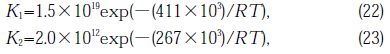 where R is the gas constant (J mol-1 K-1). At T=873 K, K1,is much smaller than K2 ; therefore, H2 diffuses out of a specimen at a rate which is much higher than that of production. The effect of UV light is to increase K1 and the reaction proceeding to the right of Eq. (21). On the other hand, SiOH and SiH existed within 100μm from the illuminated surface together with NBOHC, and also SiSi and E' center. In the gas release measurement, O2 gas was detected. Moreover, the concentration of E' center or NBOHC decreased with increasing SiH or SiOH respectively (see Fig.9).
