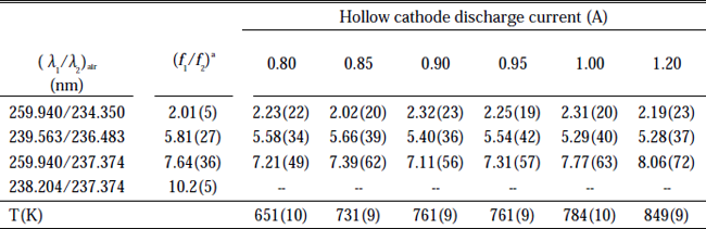 For the normalized lineshape, g(ν-ν0), we assume a full Voigt profile. The Lorentzian contribution is assumed to be primarily due to radiative (natural) broadening. The temperature of the atoms in the discharge is found by finding the best overall consistency in absorption measurements for several wellknown UV line pairs at each current used in the hollow cathode discharge.