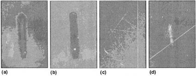 FIG.2. Micrographs of dark-field observation of 4ω beam spot, taken at x50 magnification: (a) sample A prerated for 500h at 398 ±1K in airl (b) sample B operated for 63h at 398 ±1K in air; (c) sample B reground and optically polished by 60 to 90 µm after observation of (b); and (d) sample C, irradiated for 100h at 353K in 3300 Pa of water vapor pressure.