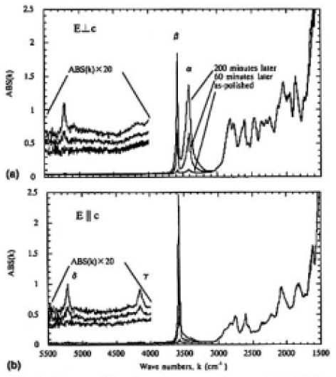 - (1) OH groups were formed in CLBO crystal when CLBO absorbed water molecules. The OH groups in CLBO crystal are detected at 3410 and 3580cm-1 as α- and β-OH bands and at 4150 and 5215cm-1 as γ- and δ- OH-related bands in the IR absorption spectrum.