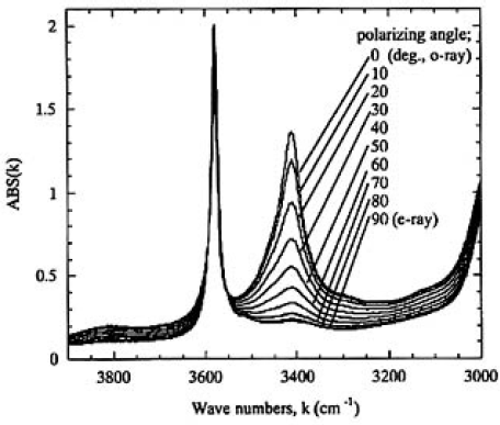 FIG.5. O-ray absorption spectra of α- and β;-OH bands measured for sample H (thickness 1.9mm) from o-ray (0 degrees) to e-ray (90 degrees).