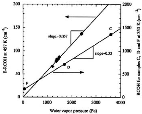 FIG.7. Plots of the obtained E-RCOHs from samples I and J at 457K as a function of water vapor pressures maintained. Circle plots are for samples C, D and F irradiated at 353K. The straight line is the result of regression fit to data.