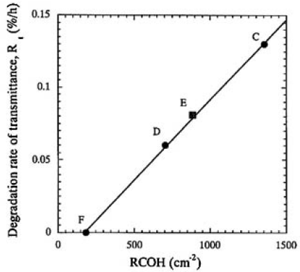 FIG.9. Relationship between the degration rates of transmittance and RCOH for samples C, D, E and F. A linear relationship was obtained by regression fit for all the icradiated samples.