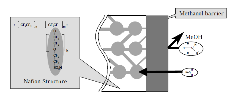 Figure 1. Nafion structure and schematic representation of proposed barrier strategy.