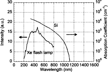 Figure 2 shows radiant spectrum of the xenon flash lamp and optical coefficient of Si. The radiant peak of the xenon flash lamp is in the range from 300 to 800 nm. Since the absorption edge of Si is approximately 1100 nm, Si sub strate can be effectively heated by the xenon flash lamp. The incident radiant energy density was measured with a calorimeter.