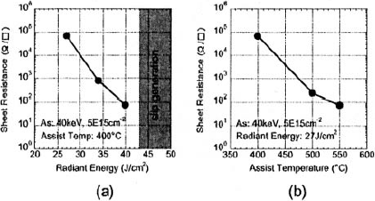 It was found that the lower sheet resistance was obtained at the higher assist temperatures for the lower radiant energy density and for the higher radiant energy density at the lower assist temperatures. That is, the incident radiant energy density required for activation depends on the assist temperature. Slip generated at above 43 J/cm2 of radiant energy in the case of assist temperature of 400°C as shown in Fig. 3(a) due to the increase in thermal strain. On the other hand, Sheet resistance abruptly decreases with assist temperature. Therefore, the appropriate combination of the assist temperature and the radiant energy is neccessary for activating implanted impurities.