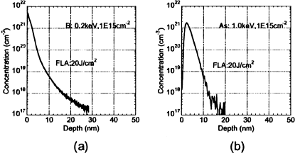 Figures 4(a) and 4(b) show SIMS depth profiles of B and As in (100)Si substrate after FLA, respectively. Implant conditions are 0.2 keV, 1 × 1015 cm-2 for B and 1 keV, 1 × 1015 cm-2 for As, respectively. Both show abrupt profiles with the high peak concentrations above 1021cm-3. This suggests that FLA technology has the possibility of creating the super-shallow junction below 20 nm under the optimum conditions.