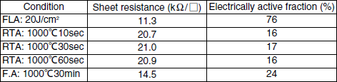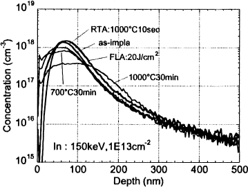 On the other hand, the profile for FLA is similar to that for the as-implanted case. Comparison of the sheet resistance and the electrical activation between the conventional annealing and FLA is summarized in Table I. After the conventional annealing, the sheet resistance was about 20 kΩ/□, and the elctrically active fraction was about 20 %. On the other hand, after FLA under the optimum conditions, the sheet resistance was 11.3 kΩ/ □, and the electrically active fraction was 76 %. That is, the maximum electrical activation for the minimum amount of diffusion can be obtained by FLA. From these results, it is considered that the annealing for longer time at higher temperature induces the deactivation of In.