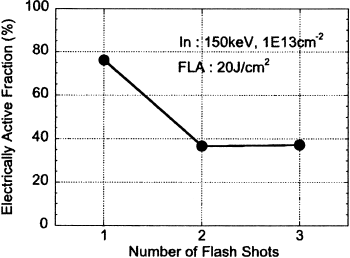 It was found that the single shot was able to create an abrupt profile with higher activated In concentration as shown in Fig. 6. In the case that the number of flash shots was 2 and 3, however, the electrically active fraction was belonw 40 %. Thus, FLA is very effective in electrical activation of In maintaining as-implantd profile. This result is very useful for channel engineering in sub 0.1µm MOSFETs.