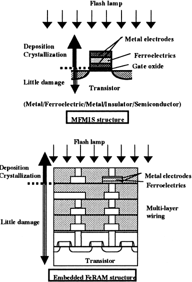 FeRAM embedded LSIs have potential for use in multifunctional IC cards, RF cards, memory embedded micro controllers etc.. However, capacitor degradation during ILD CVD and RIE processes and cross contamination problems during device integration have been reported. Formation of ferroelectric capacitors on top of Al wiring is a way to overcome the problems. Furthermaore, 1Tr (transistor) type FeRAM is a candidate to make a high density Gbit memory. It is significant to form ferroelectric films on transistor gates without interface degradation. In order to achieve the devices suppression of thermal damage to the substrates is essential. We have developed an ultimate rapid thermal process called flash lamp process to crystallize PZT films (Fig.1).