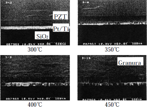 Fig.4 Microstructures of PZT films on Pt crystallized by flash lamp at various assist temperatures.