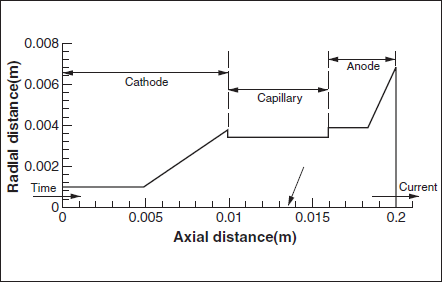 The model solves the time-dependent transport equations of mass, momentum and energy for a compressible fluid. Azimuthal magnetic field compresses the plasma towards the plasma axis and causes the Z-pinch. Curl of Ampere’s law, which is a derivation of Maxwell’s equations, is solved to get the magnetic field. The current density distribution in the plasma is obtained by solving the Laplace’s equation. Solution of current density (J) and magnetic field (B) paves the way to include the Lorentz forces or the JxB terms in the momentum equations. The radiation term in the energy balance equation is introduced using P-1 radiation model [2]. A vendor-supplied CFD (computational fluid dynamics) package, Fluent, is used as the computing platform, where all equations have been solved through customized routines. Figures 1 and 2 illustrate the axi-symmetric geometry and the current profile respectively. A time step of 1 ns has been chosen in the calculations.