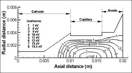 For the discharge medium of xenon and a flow-rate of 100 sccm, Fig. 3 depicts the isocontours of temperature in electron-volt (eV) at the time of 137 ns of the current pulse. The maximum temperature at this instant of time has been calculated as about 14 eV. In a comparison of flow-rate effect, it has been seen that hot plasma-core advances along the axial direction with the increase of flow-rate, which is in line with the experimental evidence.