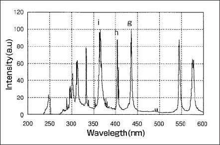 Fig.1 shows a spectral distribution of a lamp used in semi-conductor lithography. The g-, h-, i-lines are observed at 436, 405 and 365 nm in wavelength, respectively. In Fig.2 the spectral distributions of the lamp designed to emit stronger g-, and h-lines are shown. Lamps of this type are suitable for LCD exposures processes.