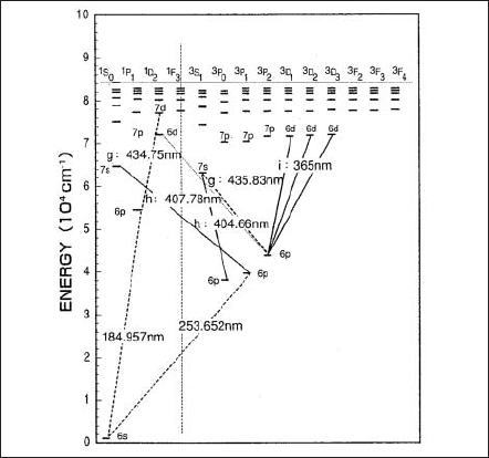 An Hg atom excited by the electron emitted from a cathode will eventually lose its energy through transition to ground state or metastable state. The energy difference between the states is emitted as a line spectrum. The energy level diagram of Hg in Fig.3 shows that g-, h- and i-line has a few lines in neighbor. The Continuum emission occurs by recombination of mercury ions with free electrons. The emitted energy, hence the wavelength is expressed as a function of the kinetic energy of an electron and the ionization energy of mercury.
