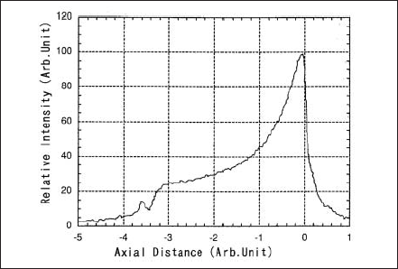 There are four important properties for the super-high pressure Hg lamp: the electrical property, thermal property, optical property and the lifetime. The electrical properties are described by breakdown voltage, transitional current during the warm-up, and the voltage and current in steady burning. Under steady operation at constant power input, the lamp voltage increases and the current decreases as the distance between cathode and anode increases or Hg pressure increases. Regarding the thermal properties the temperature of the lamp bulb must be kept in the designated range since it is important for the light output performance determined by Hg pressure. Among optical properties the spectral distribution has been described in section A. An example of the angular distribution of radiation from the lamp is shown in Fig.4 for the case that the lamp is burning anode upside. Fig.5 shows a quantity corresponding to the radiant intensity of the arc observed when the arc image is projected along a line parallel to a lamp axis. Maximum radiant intensity is obtained at nearby cathode tip and gradually decreases toward anode. Lifetime property is given by the decrease of the illuminance and the degradation of the silica glass bulb. The former is mainly caused due to the increase of evaporation and deposition of electrode materials at the inner surface of the bulb, and light scattering takes place, accordingly the transmissivity decreases.