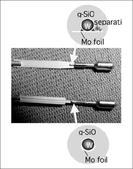 A sealing between silica glass and the electric-feed metal has been established by a molybdenum (Mo) ribbon. Here, there are two factors to determine the sealing strength: the structural shape and the adhesiveness of the SiO2 -Mo ribbon interface. As shown in Fig. 7, thewelding portion of the Mo ribbon is curved in form to fit to the end of electrode to minimize stress generation in the glass. In this way, the separation of the SiO2 -Mo ribbon interface was quite restrained as compared to the flat ribbon cases. It was good to make use of an Y2O3-CeO2 doped Mo ribbon (MY-ESS, Plansee Aktiengesellschaft) to obtain stronger adhesiveness at the interface [5]. However, that was not enough for the NSH lamp, because the impurities like Ar, Hg, and Br for the SiO2 and/or Mo may exist in the interface and weaken the force during high temperature sealing process of the closed tube. To avoid the contaminant at the interface and unexpected separation, or in worst case, fracture of the lamp during operation, the Mo ribbon may be coated by a few hundred nanometers of SiO2 film after the treatment for elimination of native oxides and/or organic compounds by hydrogen gasses [6]. In the conventional burner seal, the vapor of SiO2 from the envelope deposits on the Mo ribbon by few ten nanometers (depending on the atmosphere inside the tube), and the interface is formed when the seal portion of the envelope was shrunken and touched to the ribbon. On the other hand, the interface of Mo-SiO2 layer formed by coating method is considered to be dense, very clean and strongly bonded to each other.