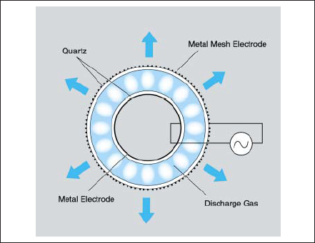 Conventional lamps radiate the emission due to the atom transition, molecular transition, or recombination, but excimer lamps are unique in emission from excited dimmer, or excimer. We put them to practical use with use of dielectric barrier discharge. Barrier discharge has been commonly used as ozonizer for a long time [8] and was known to radiate rare gas excimer emission [9]. Barrier discharge can establish non-equilibrium equilibrium discharge relatively easily at almost atmospheric pressure. These features are desirable for excimer production. Barrier discharge type excimer lamp has more features that a) no electrodes inside the tube broaden gas selection, b) free tube design, c) high efficiency.