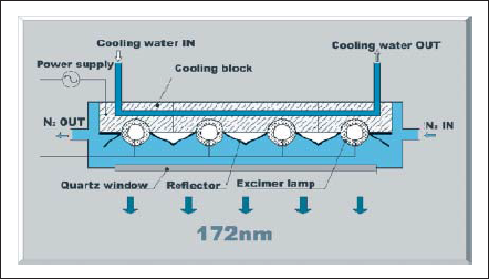 Some excimer lamps are arranged in parallel to achieve large area irradiation. Fig. 10 shows a typical excimer lamp unit. Each lamp is bedded in water-cooled lamp bracket. Light reflectors between the lamps increase forward radiation and improve the uniformity of light intensity distribution. Lamp unit is filled with dry nitrogen gas. Dry nitrogen gas does not absorb 172nm-light and helps lamp electrodes and reflectors from oxidation. A large area quartz window keeps dry nitrogen gas inside the lamp unit and permits 172nm to emit forward. An example of commercially availablelamp unit is shown in Fig.11.