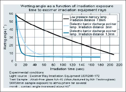 172nm excimer lamp cleaning is also applied in organic electroluminescence display (OELD) manufacture process. Emissive organic layer with low molecule is weak for moisture and decreases its intensity rapidly. OELD’s cover must be sealed by adhesive cement so that OELD is blocked off from air completely. Its contact surface condition is very important for quality. Photo cleaning of organic compounds on the contact surface improves the adhesion strength and life reliability. It is proved the effectiveness of 172nm photo cleaning process. We introduce a new wafer cleaning technique with ionic or ozonic water irradiated by excimer lamps, so called“functional water”. 172nm excimer emission improves hydrophilia of wafer surface against ionic water and ozonic water. It also gives additional energy for spread water over the wafer surface, and promotes reaction speed. This effect is proved in the KrF resist removal [13].