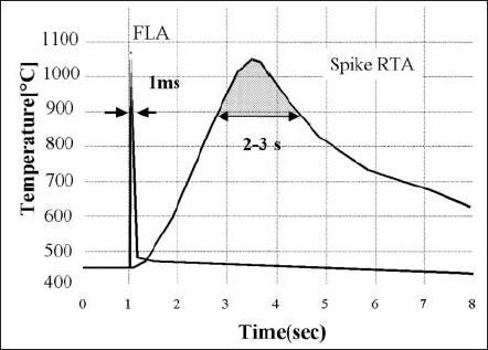 Fig. 16 shows the typical temperature profiles of the current spike RTA and FLA by comparison. In the case of spike RTA, in which the peak temperature is 1050ºC, the total time of ramp-up and ramp-down (from 900ºC to 1050ºC and from 1050ºC to 900ºC) is about 3 s. On the other hand, FLA can reduce the annealing time to the millisecond range [18].