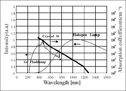 Fig. 15 shows the typical emission spectra of a xenon flash lamp and a tungsten halogen lamp, and the absorption characteristics of crystal silicon. Whereas the emission intensity of the tungsten halogen lamp is high at longer wavelengths, the emission spectrum distribution of the xenon flash lamp is white light and the intensity is high in the broad visible spectral region, particularly at wavelength in the range from 300 to 600 nm. Since the rate of photon absorption of crystal silicon is high in the shorter wavelength region, the radiant energy of the xenon flash lamp can be more efficiently absorbed in silicon than that of the tungsten halogen lamp.
