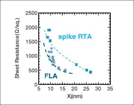 Fig. 17 shows the sheet resistance and the junction depth (xj@5x1018cm-3) map for RTA and FLA. The active concentration limit for FLA is much higher than that for RTA. RTA cannot be extended beyond the 90 nm technology node. On the other hand, FLA can satisfy the requirements of 70 nm technology node.