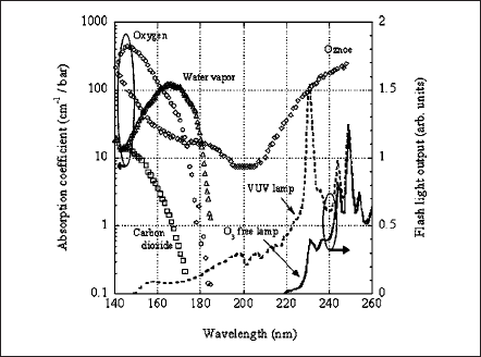 The spectral distributions of the VUV lamp and the O3 free lamp in the UV-VUV region are shown in Fig. 4. The absorption coefficient curve of the atmospheric main constituent: oxygen( O2), water vapor, carbon dioxide, and ozone, which may be reaction products from oxygen, are also shown. Oxygen and water vapor have larger absorption coefficients in the VUV spectrum region.