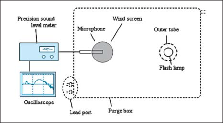 In order to avoid the frequency change on the sound source due to lamp fixation, the flash lamp was hung by its lead wires. The sound pressure was detected by the micro-phone(UC-29, RION Inc.)and the wave form was recorded by an oscilloscope(9310A, LeCroy Inc.) through the precision sound level meter(NA-41, RION Inc.)of which the detectable frequency region is 20 Hz-100 kHz.